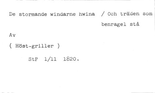 De stormande windarne hwina / Och träden som //// benragel stå //// Av //// ( Höst-griller ) //// StP 1/11 1820.