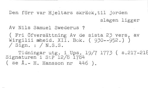 Den förr var Hjeltars skräck,til jorden //// slagen ligger //// Av Nils Samuel Swederus ? //// ( Fri öfversättning Av de sista 2) vers, av Wirgilii wheid. XII. Bok. ( 9)0-952.) ) / Sign. : / N.S.S. //// Tidningar utg. i Ups. 19/7 1773 ( s.217-21E Signaturen i StP 12/8 1784 //// ( se Å.- H. Hansson nr 446 ).