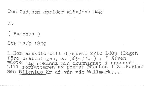 Den Gud,som sprider glädjens dag //// Av //// ( Bacchus ) //// StP 12/9 1809. //// L.Hammarsköld till Gjörwell 2/10 1809 (Dagen //// före drabbningen, s. 369-370 ) " Äfven //// måste jag erkänna min okunnighet i anseende till forrattaren av poemet Bacchus i St.Posten //// Men Silenius är af vår vän WaIlmark..."