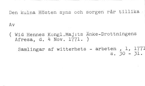 Den kulna Hösten syns och sorgen rår tillika Av //// Wid Hennes Kongl.Maj:ts Änke-Drottningens Afresa, d. 4 Nov. 1771. ) //// Samlingar af witterhets - arbeten , 1, 1771 //// s. 30 - 31.