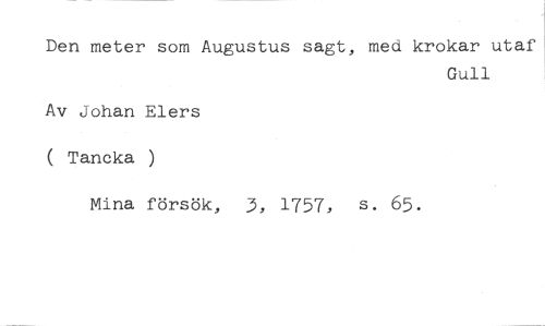 Den meter som Augustus sagt, med krokar utaf. //// Gull //// Av Johan Elers ( Tancka ) //// Mina försök, 3, 1757, s. 65.
