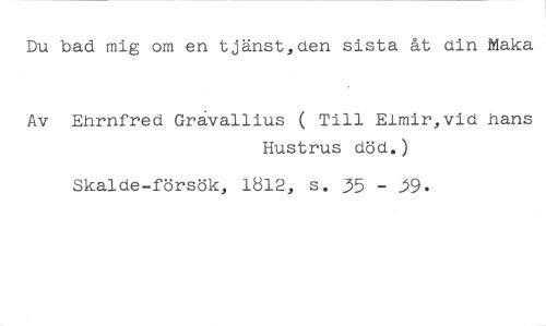 Du bad mig om en tjänst,den sista åt din Maka //// Av Ehrnfred Gråvallius ( Till Elmir,vid hans //// Hustrus död.) //// Skalde-försök, 1812, s. 35 - 9.