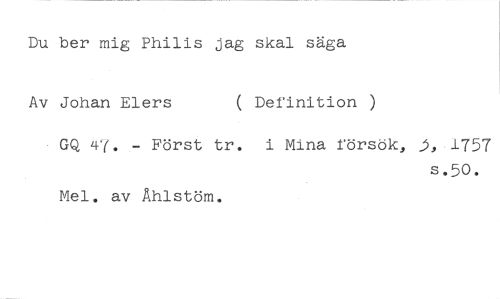 Du ber mig Philis jag skal säga //// Av Johan Elers ( Definition ) //// GQ 47. - Först tr. i Mina försök, .,-1757 //// s.50. //// Mel, av Åhlstöm.