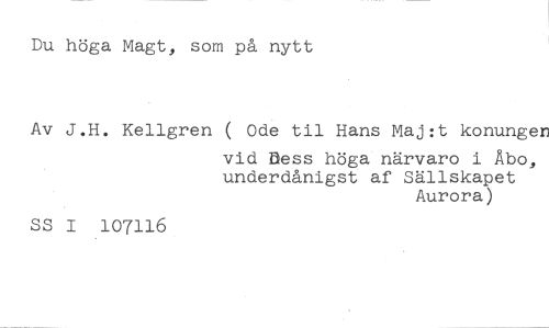 Du höga Magt, som på nytt //// Av J.H. Kellgren ( Ode til Hans Maj:t konungen //// vid Dess höga närvaro i Åbo, underdånigst af Sällskapet //// Aurora) //// SS I 107116