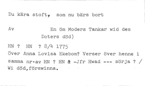 Du kära stoft). som nu bärs bort //// En öm Moders Tankar wid des Doters död) //// HN ? HN ? 8/4 1775 //// Över Anna Lovisa Ekebom? Verser över henne i //// samma nr•av HN ? HN & -Jfr Hwad --- sörja ? / Wi död,förswinna.