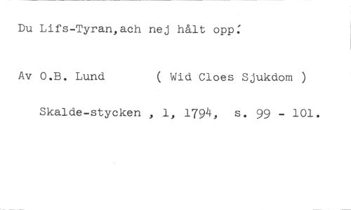 Du Lifs-Tyran,ach nej hålt opp: //// Av O.B. Lund ( Wid Cloes Sjukdom ) //// Skalde-stycken , 1794, s. 99 - 101.