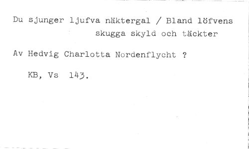 Du sjunger ljufva näktergal / Bland löfvens skugga skyld och täckter //// Av Hedvig Charlotta Nordenflycht ? KB, Vs 143.