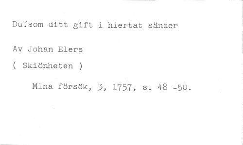 Du:som ditt gift i hiertat sänder //// Av Johan Elers ( Skiönheten ) //// Mina försök, 3, 1757, s. 48 -50.