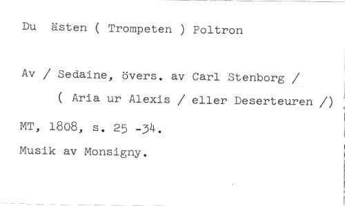 Du ästen ( Trompeten ) Poltron //// Av / Sedaine, övers. av Carl Stenborg //// /( Aria ur Alexis / eller Deserteuren /) //// MT, 1808, s. 25 -34. Musik av Monsigny.