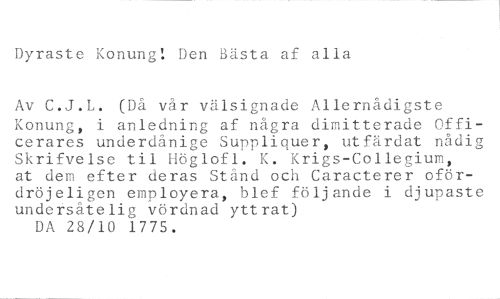 Dyraste Konung! Den Bästa af alla //// Av C.J.L. (Då vår välsignade Allernådigste //// Konung, i anledning af några dimitterade Officerares underdånige Suppliquer, utfärdat nådig Skrifvelse til Höglofl. K. Krigs-Collegium, at dem efter deras Stånd och Caracterer ofördröjeligen employera, blef följande i djupaste undetsåtelig vördnad yttrat) //// DA 28/10 1775.