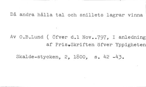Då andra hålla tal och snillets lagrar vinna //// Av O.B.Lund ( Öfver d.1 Nov..797, I anledning af Pris:Skriften öfver Yppigheten //// Skalde-stycken, 2, 1800, s. 42 -43.