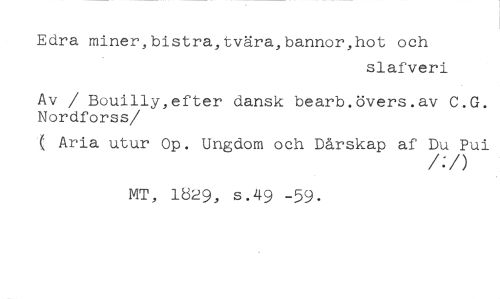Edra miner,bistra,tvära,bannor,hot och //// slafveri //// Av / Bouilly,efter dansk bearb.övers.av C.G. Nordforss //// /( Aria utur Op. Ungdom och Dårskap af Du Pui //// /;/) //// MT, 1329, s.49 -59.