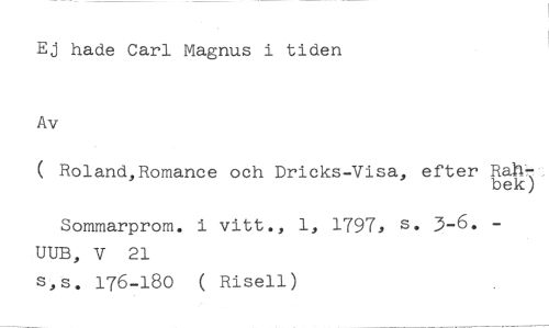 Ej hade Carl Magnus i tiden Av //// ( Roland,Romance och Dricks-Visa, efter Ra ekh- //// ) //// Sommarprom. i vitt., 1, 1797, s. 3-6. UUB, V 21 //// s,s. 176-180 ( Risell)