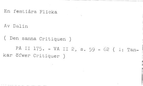 En femtiåra Flicka //// 1 //// Av Dalin //// ( Den sanna Critiquen ) //// PA II 175. - VA II 2, s. 59 62 ( i: Tan- //// kar öfwer Critiquer )