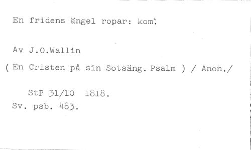 En fridens ängel ropar: kom: //// Av J.O.Wallin //// (En Cristen på sin Sotsäng. Psalm ) / Anon. //// /StP 31/10 1818. Sv. psb. 483.