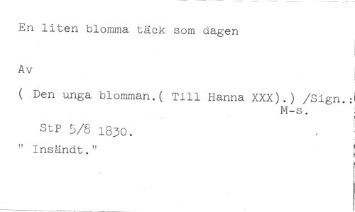 En liten blomma täck som dagen Av //// ( Den unga blomman.( Till Hanna XXX).) /Sign.:1 //// M-s. //// StP 5/8 1830. tt Insändt."