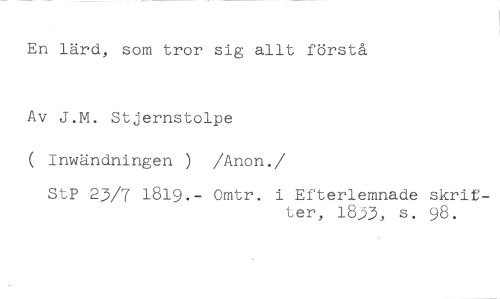 En lärd, som tror sig allt förstå //// Av J.M. Stjernstolpe //// ( Inwändningen ) /Anon. //// /StP 23/7 1819.- Omtr. i Efterlemnade skrif- //// ter, 18.53, s. 98.