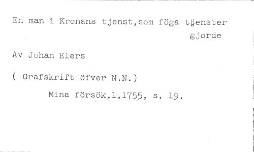 En man i Kronans tjenst,som föga täenster //// gjorde //// Av Johan Elers //// ( Grafskrift öfver N.N.) //// Mina försök,1,1755, s. 19.