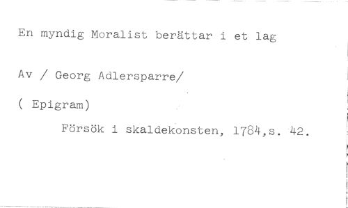 En myndig Moralist berättar i et lag Av / Georg Adlersparre //// /( Epigram) //// Försök i skaldekonsten, 1784,s. 42.