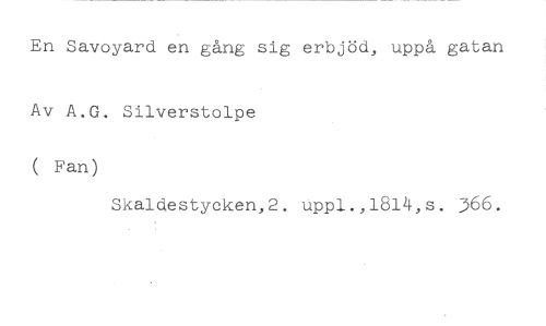 En Savoyard en gång sig erbjöd, uppå gatan //// Av A.G. Silverstolpe //// ( Fan) //// Skaldestycken,2. uppl.,1814,s. 366.