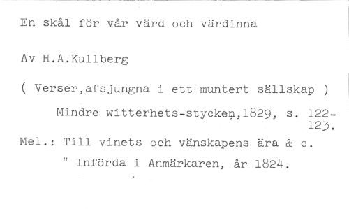 En skål för vår värd och värdinna //// Av H.A.Kullberg //// ( Verser,afsjungna i ett muntert sällskap ) //// Mindre witterhets-styckep,1829, s. 122- //// 123. //// Mel.: Till vinets och vänskapens ära & c. //// " Införda i Anmärkaren, år 1824.