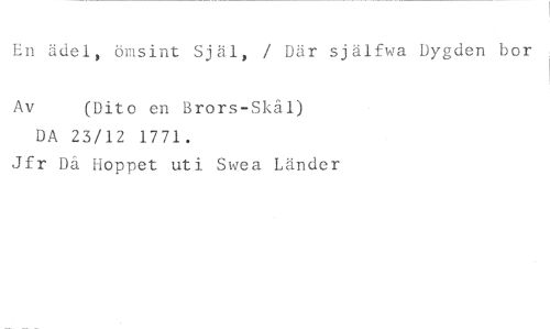 En ädel, ömsint Själ, / Där själfwa Dygden bor //// Av (Dito en Brors-Skål) //// DA 23/12 1771. //// Jfr Då Hoppet uti Swea Länder