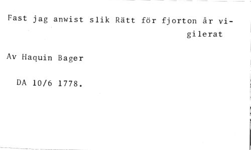 Fast jag anwist slik Rätt för fjorton år vi- //// gi lerat //// Av Haquin Bager //// DA 10/6 1778.