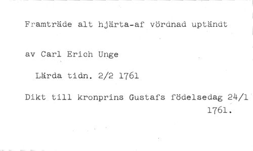 Framträde alt hjärta-af vördnad uptändt //// av Carl Erich Unge Lärda tidn. 2/2 1761 //// Dikt till kronprins Gustafs födelsedag 24/1 //// 1761.
