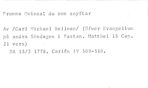 Fromma Qwinna! du som snyftar //// Av /Carl Michael Bellman/ (tfwer Evangelium på andra Söndagen i Fastan. Matthei 15 Cap. 21 vers) //// DA 13/3 1778. Carlgn IV 509-510.