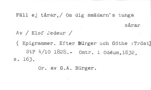 Fäll ej tårar,/ Om dig smädarn's tunga //// sårar //// Av / Elof Jedeur //// /( Epigrammer. Efter BUrger och Göthe :Tröst) //// StP 4/10 1828.- Omtr. i Odhum,1832, s. 163. //// Or. av G.A. BUrger.