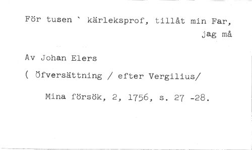 För tusen ' kärleksprof, tillåt min Far, //// jag må //// Av Johan Elers //// ( öfversättning / efter Vergilius //// /Mina försök, 2, 1756, s. 27 -28.