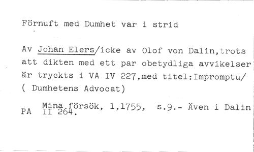 Förnuft med Dumhet var i strid //// Av Johan Elers/icke av Olof von Dalin,trots att dikten med ett par obetydliga avvikelser är tryckts i VA IV 227,med titel:Impromptu/ ( Dumhetens Advocat) //// PA Tfnhersök, 1,1755, s.9.- Även i Dalin
