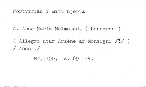 Förtviflan i mitt hjerta //// Av Anna Maria Malmstedt ( Lenngren ) //// ( Allegro utur Arshne af Monsigni /1/ ) / Anon . //// /MT,1790, s. 69 -74.