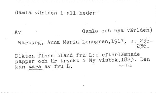 Gamla världen i all heder //// Av Gamla och nya världen) //// Warburg, Anna Maria Lenngren,1917, s. 235- //// 236. //// Dikten finns bland fru L:s efterlämnade papper och är tryckt i Ny visbok,1823. Den kan vara av fru L.