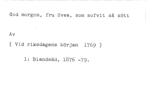 God morgon, fru Svea, som sofvit så sött //// Av //// ( Vid riksdagens början 1769 ) //// I: Blandsäd, 1876 -79.