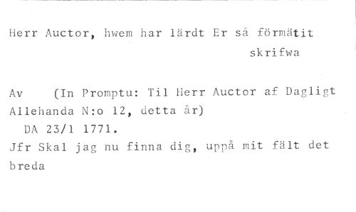 herr Auctor, hwem har lärdt Er så förmätit. //// skrifwa //// Av (In Promptu: Til Herr Auctor af Dagligt //// Allehanda N:o 12, detta år) //// DA 23/1 1771. //// Jfr Skal jag nu finna dig, uppå mit fält det breda