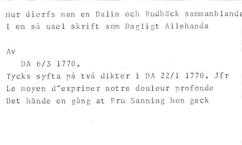 Hur dierfs man en Dalin och Rudbäck sammanbland I en så usel skrift som Dagligt Allehanda //// Av //// DA 6/3 1770. //// Tycks syfta på två dikter i DA 22/1 1770. Jfr Le moyen d'exprimer notre douleur profonde Det hände en gång at Fru Sanning hon geck