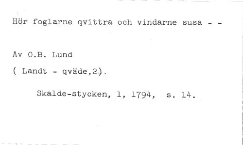 Hör foglarne qvittra och vindarne susa - - //// Av O.B. Lund //// ( Landt - qväde, //// Skalde-stycken, 1, 1794, s. 14.