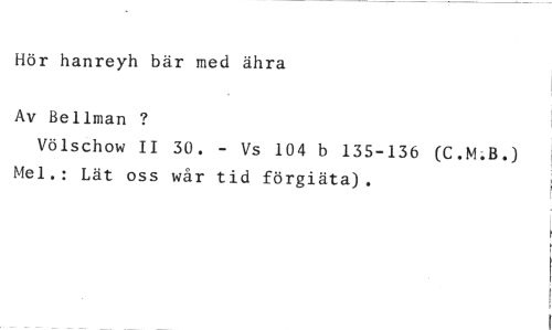 Hör hanreyh bär med ähra //// Av Bellman ? //// Völschow II 30. - Vs 104 b 135-136 (C.M:B.) Mel.: Lät oss wår tid förgiäta).
