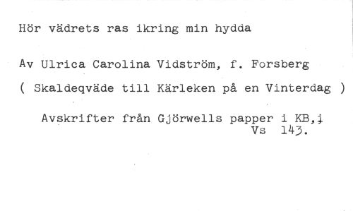 Hör vädrets ras ikring min hydda //// Av Ulrica Carolina Vidström, f. Forsberg //// ( Skaldeqväde till Kärleken på en Vinterdag ) //// Avskrifter från Gjörwells papper i KB,. //// Vs 143.