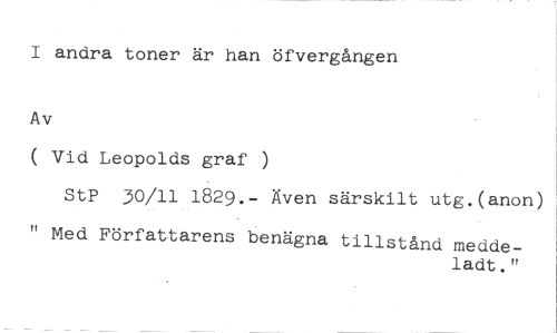 I andra toner är han öfvergången //// Av //// ( Vid Leopolds graf ) //// StP 30/11 1829.- Även särskilt utg.(anon) //// " Med Författarens benägna tillstånd medde- //// ladt."