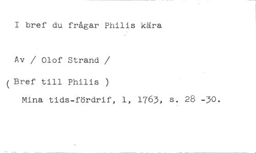 I bref du frågar Philis kära //// Av / Olof Strand //// /( Bref till Philis ) //// Mina tids-fördrif, 1, 1763, s. 28 -30.
