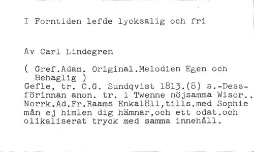 I Forntiden lefde lycksalig och fri Av Carl Lindegren //// ( Gref.Adam. Original.Melodien Egen och Behaglig ) //// Gefle, tr. C.G. Sundqvist 1813.(8) s.-Dessförinnan anon. tr. i Twenne nöjsamma Wisor.. Norrk.Ad.Fr.Raams Enka1811,tills.med Sophie mån ej himlen dig hämnar,och ett odat.och olikaliserat tryck med samma innehåll.
