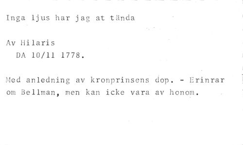 Inga ljus har jag at tända //// Av Hilaris //// DA 10/11 1778. //// Med anledning av kronprinsens dop. - Erinrar om Bellman, men kan icke vara av honom.