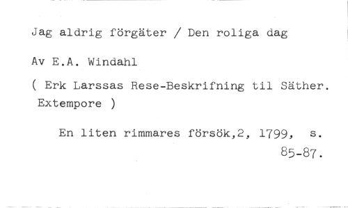 Jag aldrig förgäter / Den roliga dag Av E.A. Windahl //// ( Erk Larssas Rese-Beskrifning til Säther. Extempore ) //// En liten rimmares försök,2, 1799, s. //// 85-87.