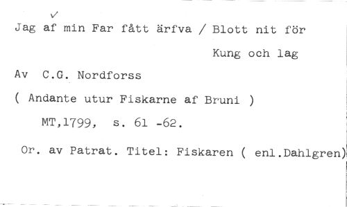 VA //// Jag af min Far fått ärfva / Blott nit för //// Kung och lag //// Av C.G. Nordforss //// ( Andante utur Fiskarne af Bruni //// MT,1799, s. 61 -62. //// Or. av Patrat. Titel: Fiskaren ( enl.Dahlgren)
