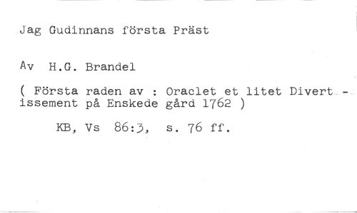Jag Gudinnans första Präst Av H.G. Brandel //// ( Första raden av : Oraclet et litet Divertissement på Enskede gård 1762 ) //// KB, vs 86:3, s. 76 ff.