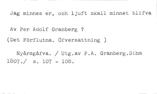 Jag minnes er, och ljuft skall minnet blifva //// Av Per Adolf Granberg ? //// (Det Förflutna. Örversattning ) //// Nyårsgårva. / Utg.av P.A. Granberg.Sthm 1807./ s. 107 - 108.