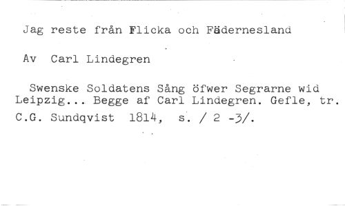 Jag reste från Flicka och Fädernesland Av Carl Lindegren //// Swenske Soldatens Sång öfwer Segrarne wid Leipzig... Begge af Carl Lindegren. Gefle, tr. //// C.G. Sundqvist 1814, s. / 2 -3/.