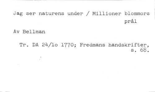 Jag ser naturens under / Millioner blommors //// prål //// Av Bellman //// Tr. DA 24/10 1770; Fredmans handskrifter, //// s. 68.